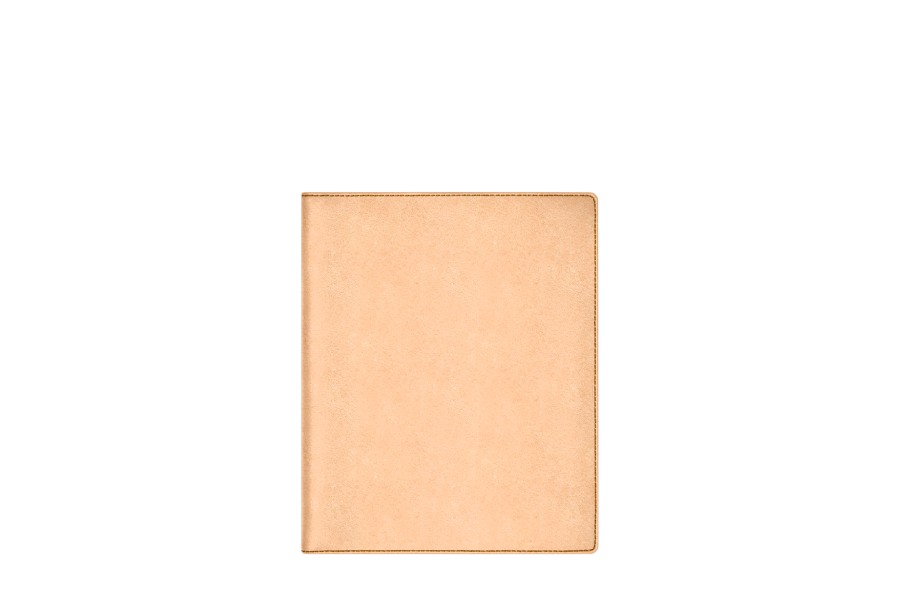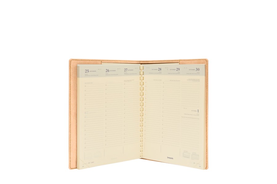 Agenda de bureau rechargeable en cuir naturel, livré avec un semainier - une semaine sur deux pages - spiralé de marque Brepols Timing.